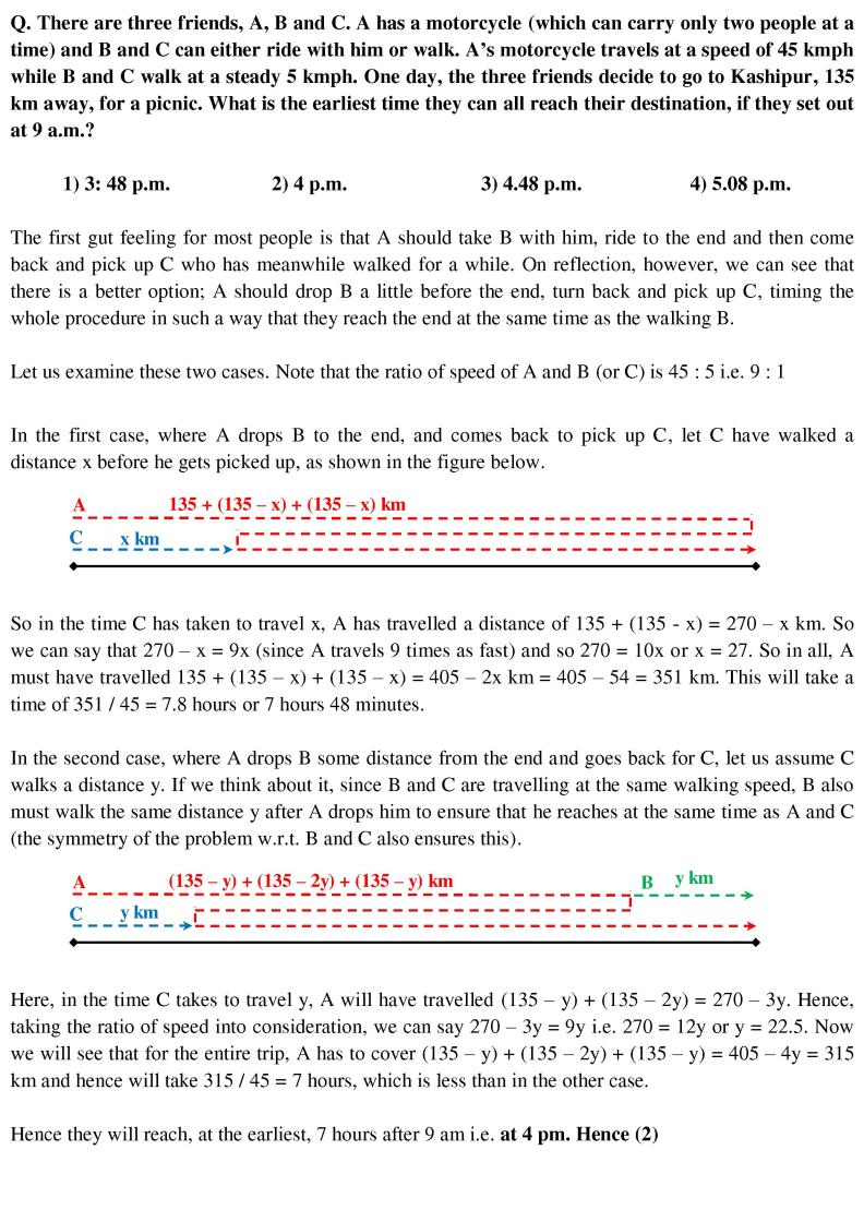 6. HI, I had a doubt in the first case where the time taken by A is 7 hrs and 48 mins. So when I was calculating, I took the situation as that C must be walking when A is coming back after dropping B, i.e, the relative speed of A and C to be considered. Can you tell me where this approach is wrong?