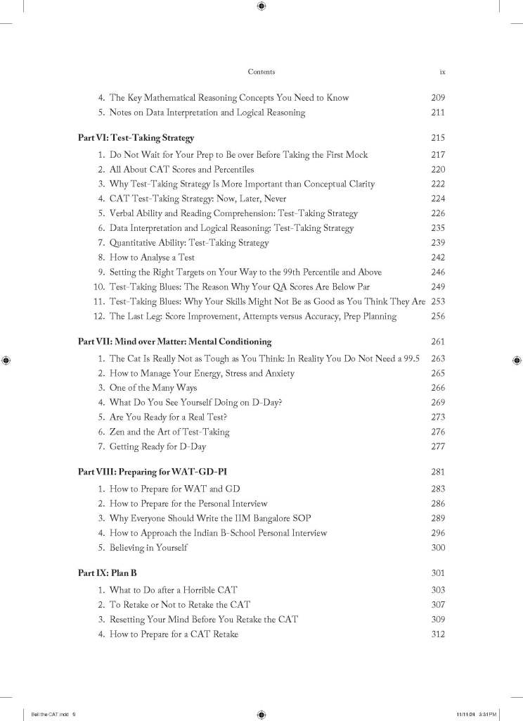 The book begins with MBA & Career Planning and profile building. It goes on to cover prep planning and test-taking strategies before dealing with the psychological aspect of test-taking: handling exam pressure, managing yourself, and conditioning your mind for D-day. It ends with WAT-GD-PI prep and also covers what you need to do incase you do not crack the exam on your first attempt. The Table of Contents below will give you all the details.